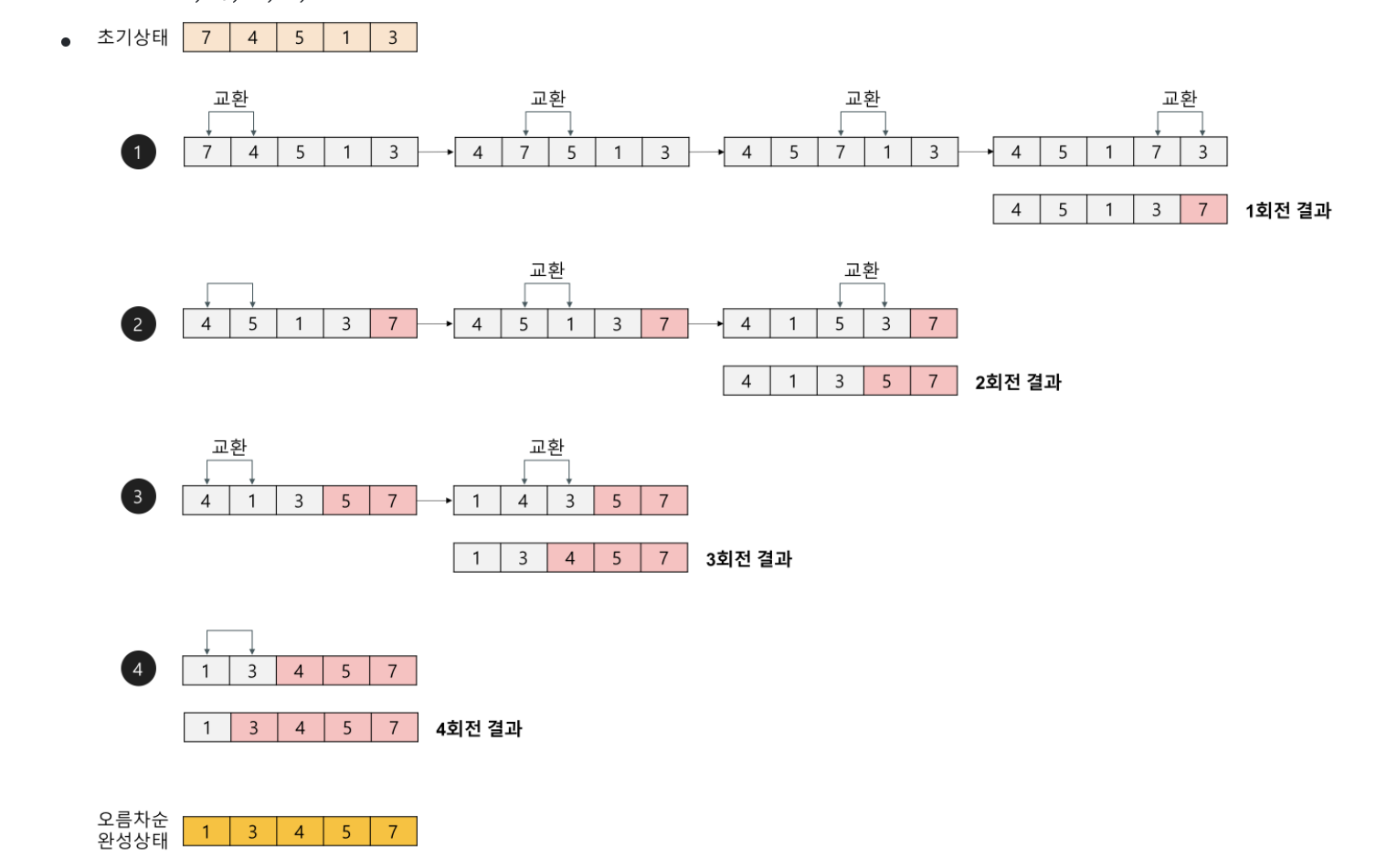 위의 그림과 같이 버블정렬은 각 회전마다 서로 붙어있는 index를 비교해 더 큰 숫자가 뒤로 가게 for문을 돌리는 방법이다.